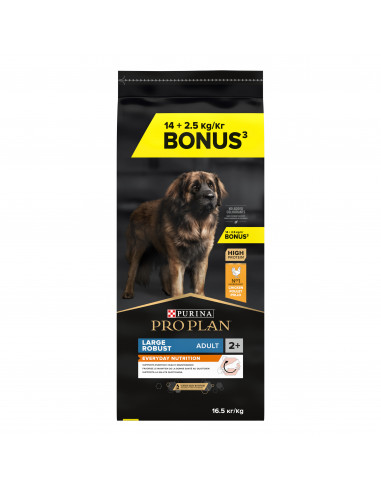 Pro Plan Cão Grande Robusto Everyday Frango é um alimento completo para cães adultos de porte grande com um físico robusto, com um elevado teor de proteína. Na Purina, a equipa de nutricionistas e médicos veterinários especialistas aplicam a ciência de última geração para desenvolver a nossa combinação de nutrientes mais avançada e eficiente para o seu animal de companhia. Este alimento seco para cão contém vitamina D, minerais e níveis específicos de ómega-3 (0,3%) para ajudar a suportar dentes e gengivas saudáveis. É rico em frango de elevada qualidade e oferece uma nutrição ótima para alimentar as aventuras do seu cão de porte grande a partir dos 24 meses até aos 7 anos de idade