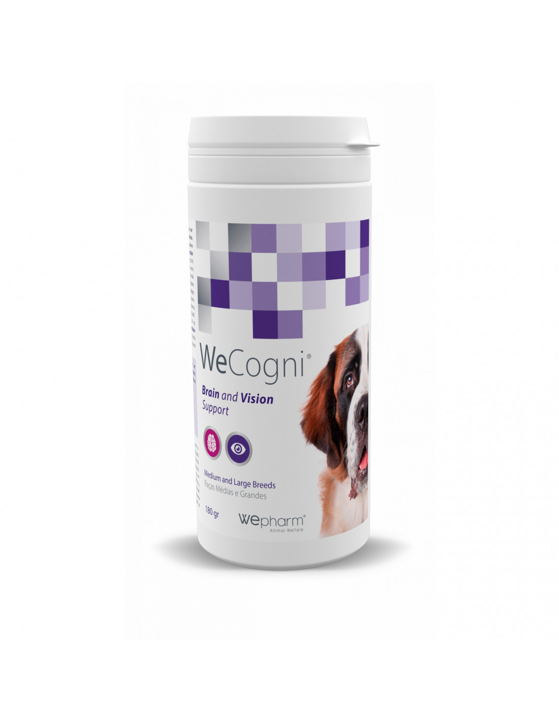 WeCogni® é um alimento complementar para cães e gatos composto por Ómega 3, antioxidantes, vitaminas, minerais e outras substâncias, para ajudar na função cerebral e saúde da visão em animais de companhia. Animais com menos de 12 Kg: 1 colher por dia (3 g) Animais com peso entre 12 e 32 Kg: 2 colheres por dia (6 g) Animais com mais de 32 Kg: 3 colheres (9 g) Saccharomyces cerevisiae, Extrato de Uva, DHA, Ginko biloba, Beta-caroteno, Zinco, Vitamina E, Vitamina C, Camellia sinensis, Melofeed, L-Carnitina, Fosfatildilserina, Biotina, Selenio- Cuidados especiais
