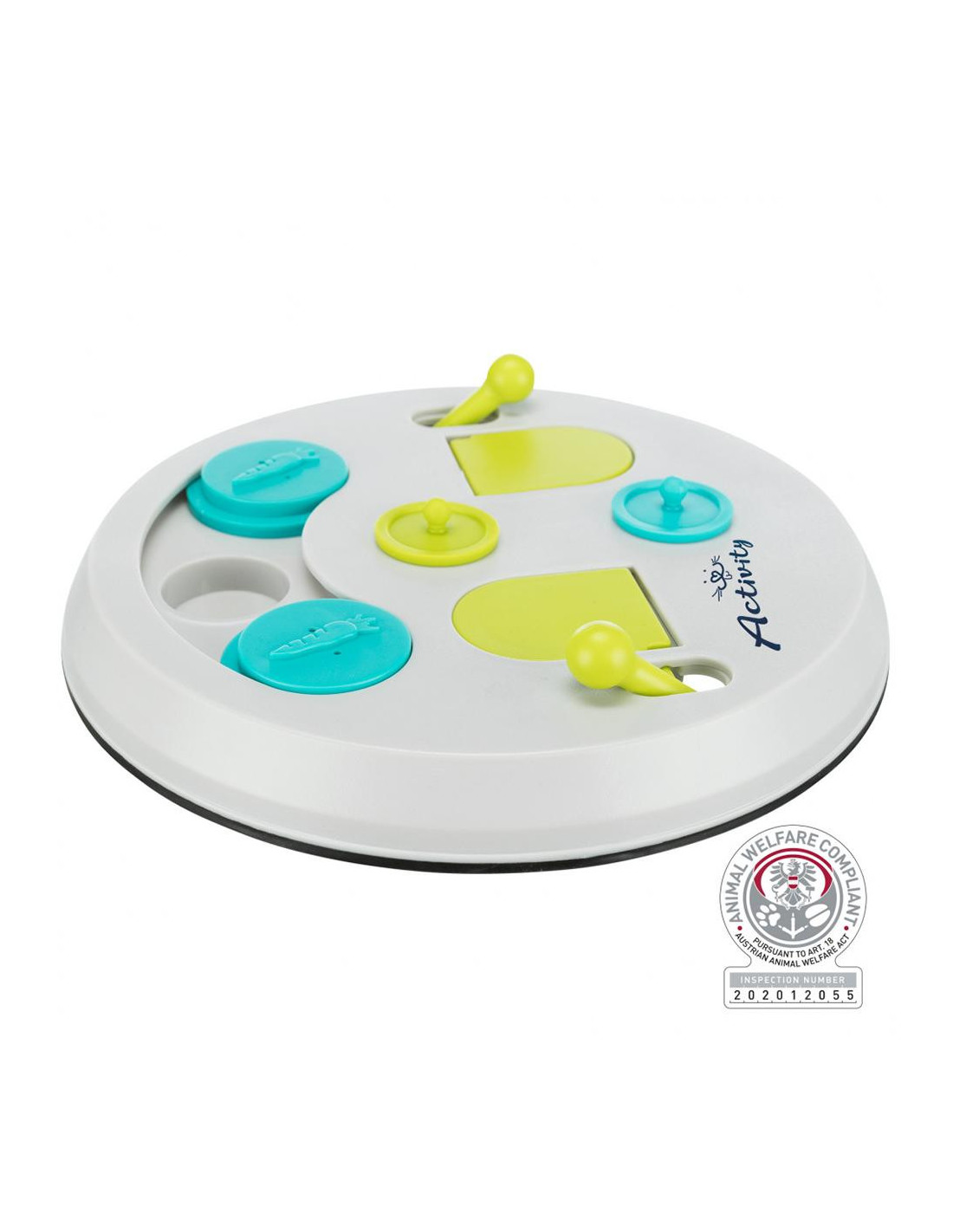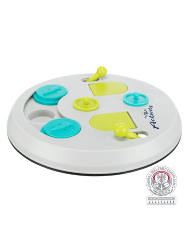 - o animal obtém a sua recompensa utilizando diferentes técnicas para abrir os orifícios - tabuleiro de jogo com 2 tampas e orifícios com tampas articuladas e deslizantes - exercício indicado para estimulação mental das várias espécies - desenvolve a destreza do animal - inclui livro com instruções e dicas para um ótimo treino - pode ser lavado na máquina da louça - anti-derrapante, graças ao anel em borracha - plástico - lavável na máquina da louça - ø 23 cm